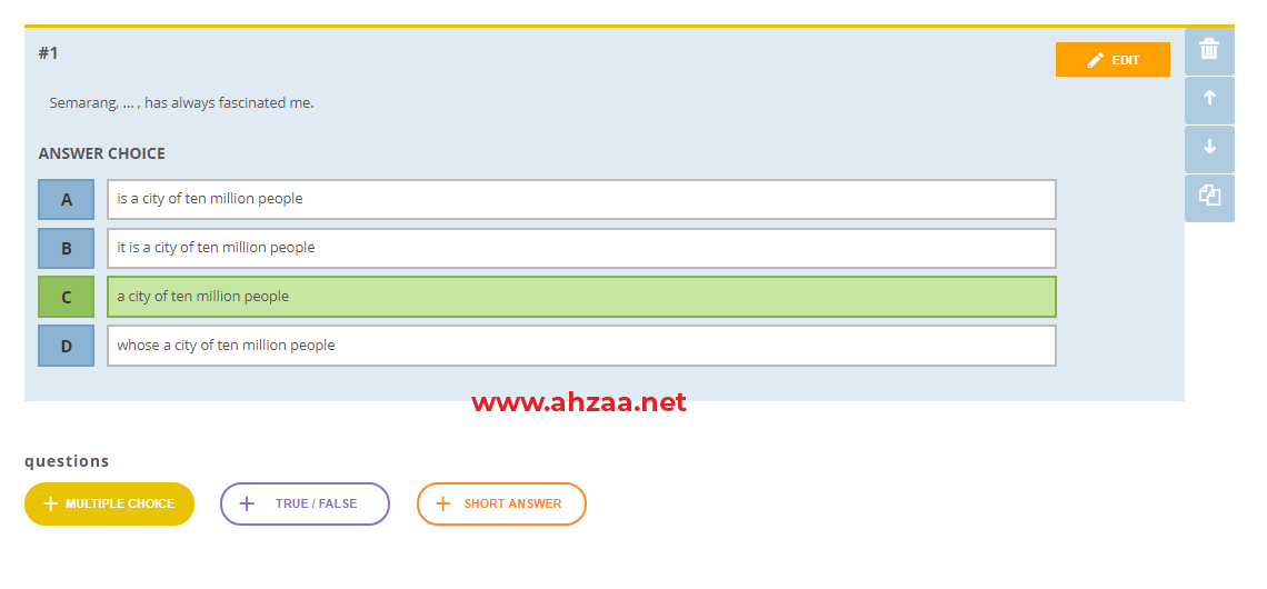 Tambahkan pertanyaan selanjutnya dengan memilih jenis pertanyaan, apakah multiple choice, true false, dan short answer. Bila jenis pertanyaan sama seperti sebelumnya, silahkan pilih multiple choice saja.